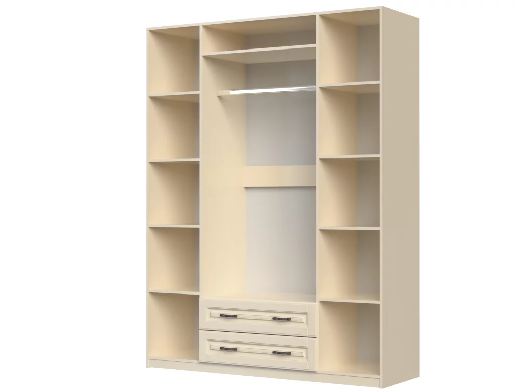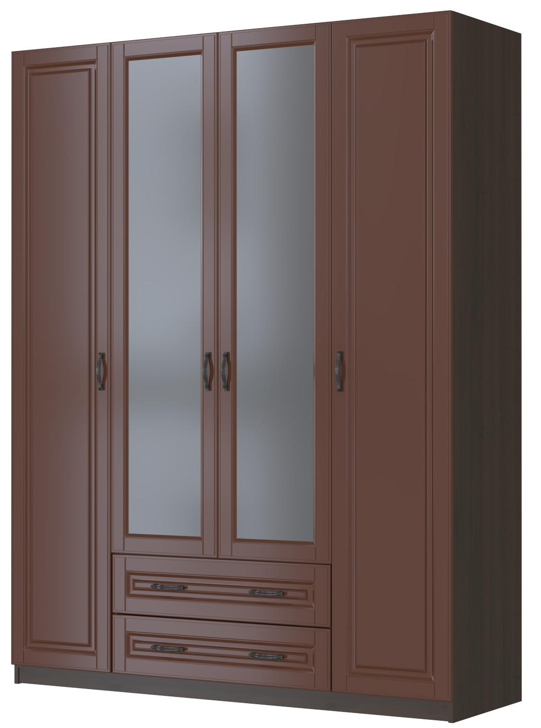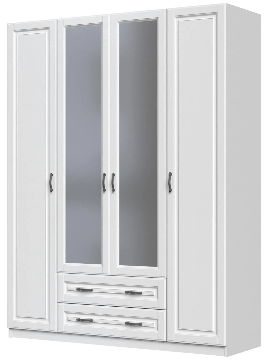 Шкаф имеет четыре распашные двери, две центральные двери с зеркалом. Внутреннее наполнение шкафа: два отделения с четырьмя полками для белья, отделение со штангой для вешалок.