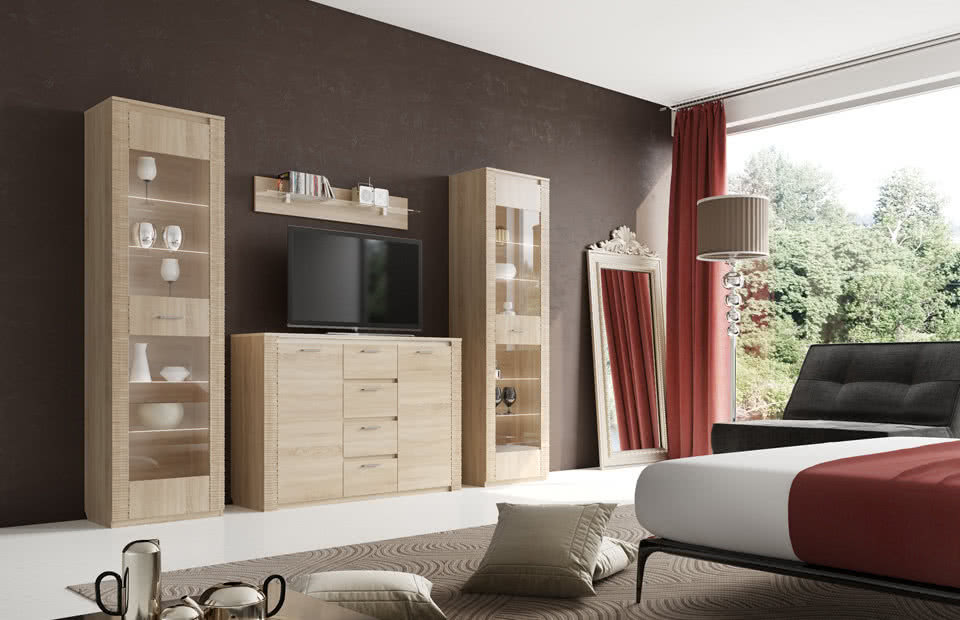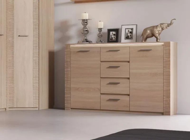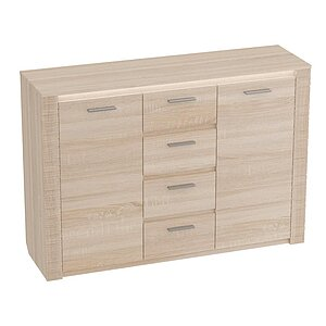 Комод оснащен четырьмя выдвижными ящиками на роликовых направляющих и двумя вместительными отделениями за распашными дверцами.