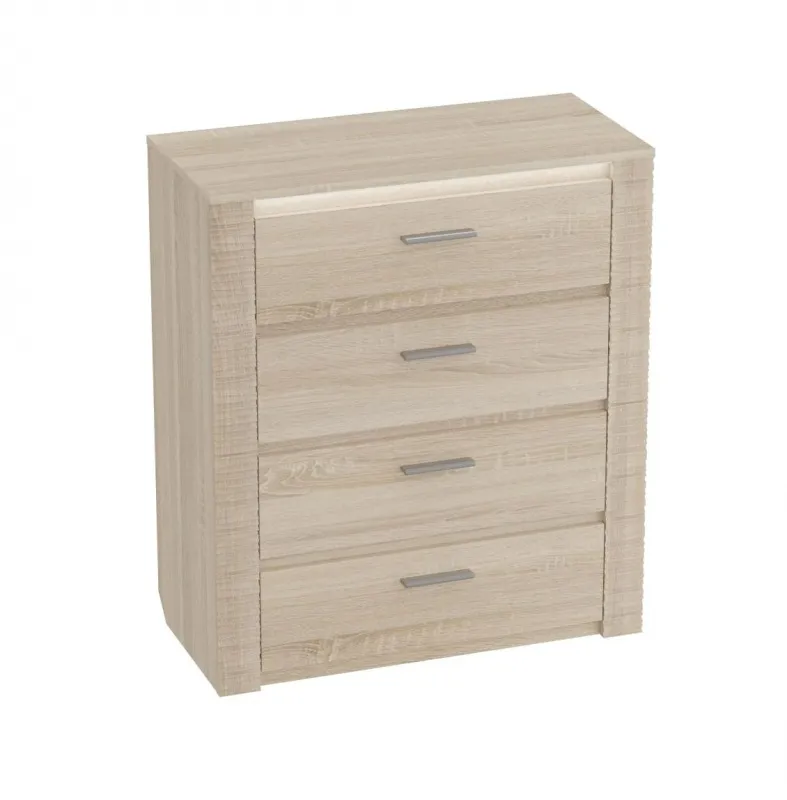 Комод оснащен четырьмя выдвижными ящиками на роликовых направляющих. Под столешницей имеется стеклянная панель (5 мм), предназначенная для установки светильника. Комплект подсветки (светильник и блок питания) приобретается отдельно. Блок питания рассчитан на подключение шести светильников.