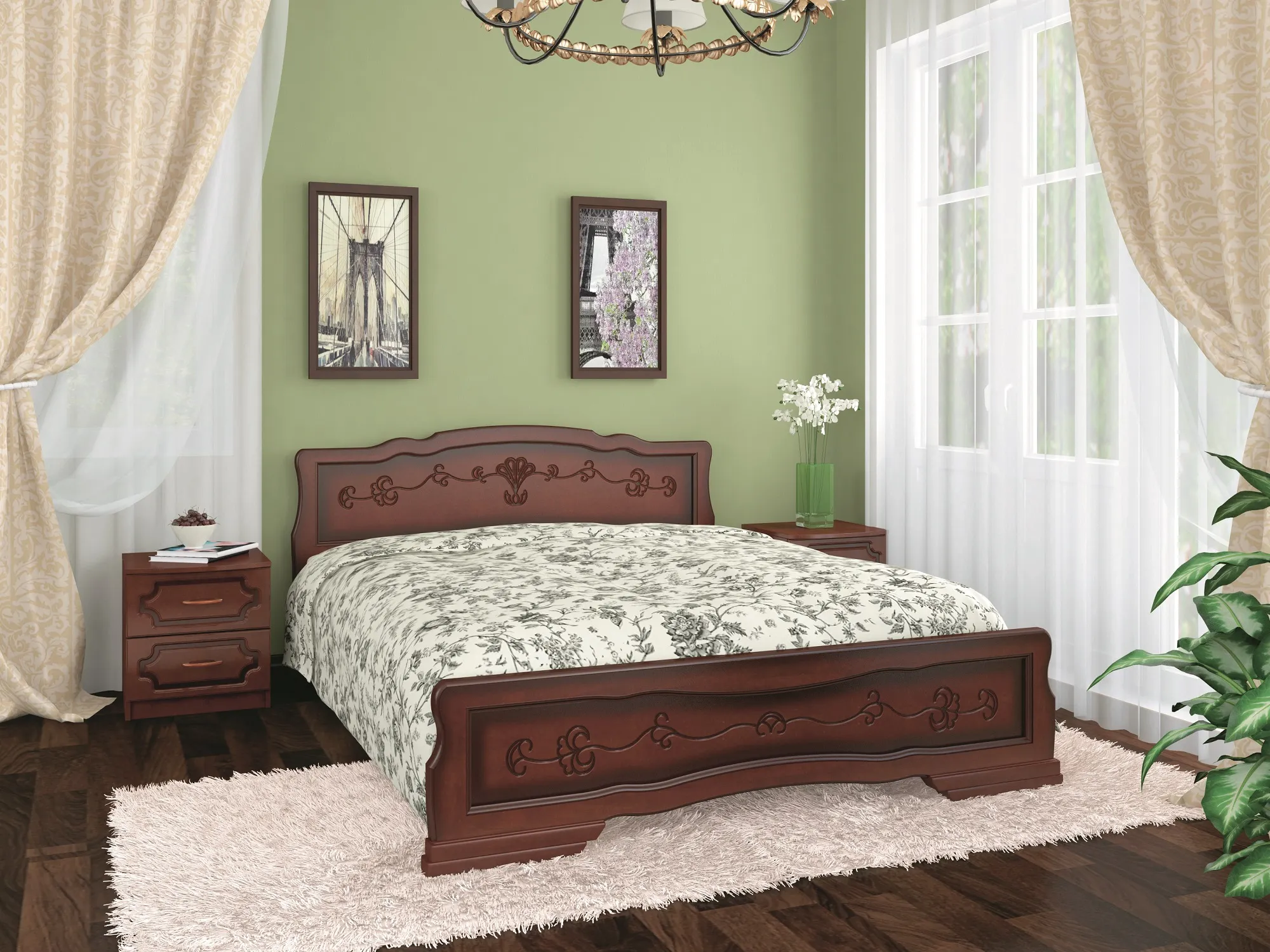 Кровать состоит из: головная спинка, ножная спинка и две двухметровые деревянные царги. Каркасы головной и ножной спинки изготовлены из массива сосны и покрашены эмалью цвета Орех. В центре изголовья и изножья имеются вставки с узором. Вставки изготовлены из МДФ. Кровать изготовлена по технологии сращивания массива. Этот метод позволяет избежать сучков и неровностей, обеспечивая гладкую и однородную поверхность, а также эстетическую привлекательность и долговечность изделия.