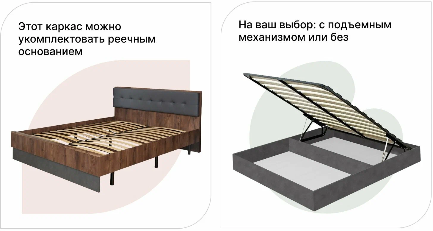 Цена на кровать указана без стоимости матраса и ортопедического основания. Кровать может комплектоваться ортопедическим основанием на 5 опорах или бельевым ящиком с подъемным механизмом. На фото в интерьере кровать представлена с бельевым ящиком