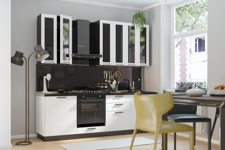 Изысканная текстура создает ощущение роскоши и уюта. Тончайшие линии фасада подчеркивают элегантность дизайна. Суперстильные черные матовые ручки добавляют кухне современности и строгости. Чёрные стёкла придают гарнитуру драматизма и глубины.
