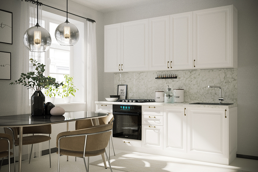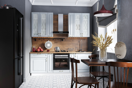 Фасады из МДФ, покрытые ПВХ-пленкой, гарантируют прочность и долговечность. Корпус кухни выполнен из ЛДСП в трёх цветах: «белый», «дуб вотан» и «дуб кальяри».