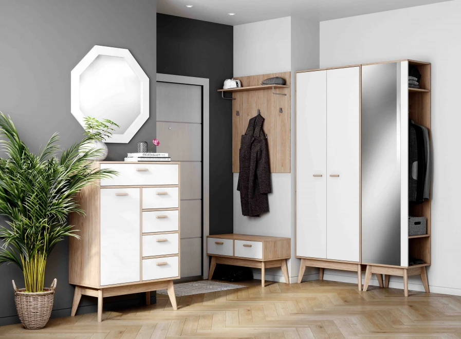 Прихожая "Калгари" выполнена в полюбившемся многими скандинавском стиле. Основной тон белый, именно он отвечает за визуальное увеличение пространства, поэтому прихожая будет выглядеть светло и уютно, просторно будет даже при небольшой площади.