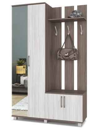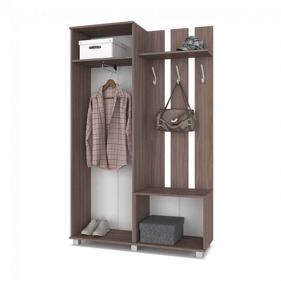 "Двурогие" крючки - на каждой из трех вертикалей открытой вешалки для верхней одежды. Над крючками - полка для головных уборов. Обувь и средства по уходу за ней удобно разместить в двухстворчатой тумбе под вешалкой.