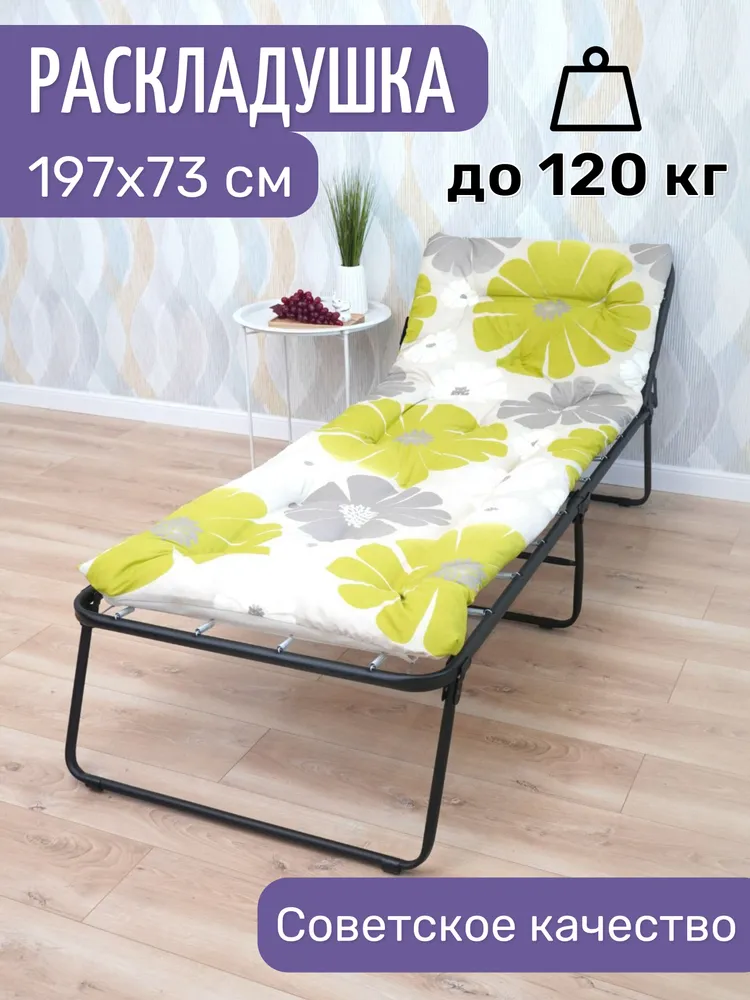 Это отличная раскладушка с регулируемым подголовником в 4 положениях. Каркас раскладушки - прочная стальная труба 25 мм, покрытая антикоррозийной порошковой краской, благодаря чему прослужит долго и не будет ржаветь. Раскладушка очень легкая и компактная, несмотря на это может выдержать нагрузку до 120 кг (максимальный распределенный вес). Представьте, восьми килограммовая конструкция держит взрослого человека 120 кг. Может выдержать и 140 при правильном обращении (испытано) : нельзя вставать на раскладушку ногами, упираться коленом, садиться на каркас трубы (иначе согнется под весом), и прыгать на ней тоже не рекомендуется, а вот лежать и спать или загорать на ней самое то, для этого она и была создана! Позволит вам с комфортом отдохнуть на любимой даче, выручит при появлении гостей, не займет много места дома -действительно компактная. Отдельный плюс этой модели ее можно использовать как шезлонг и с комфортом отдохнуть на природе, а так же незаменима при отправке ребенка в детский лагерь. Отличная раскладушка на все случаи жизни!
