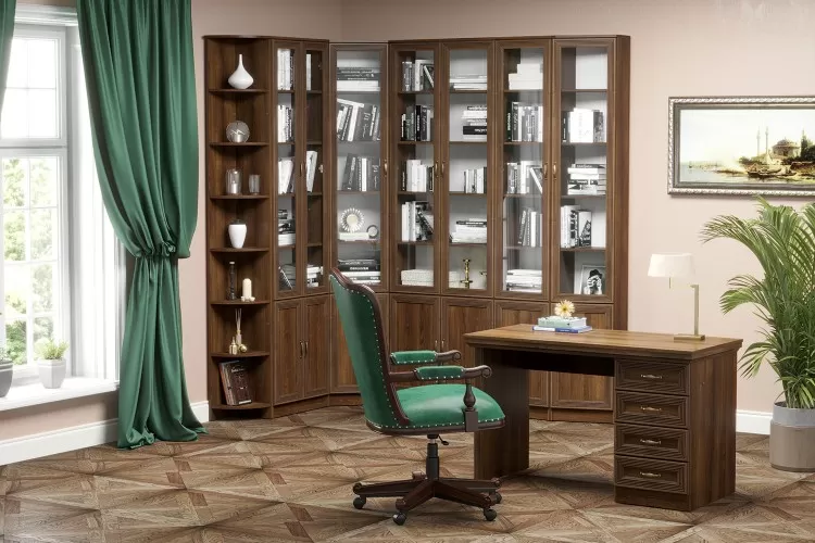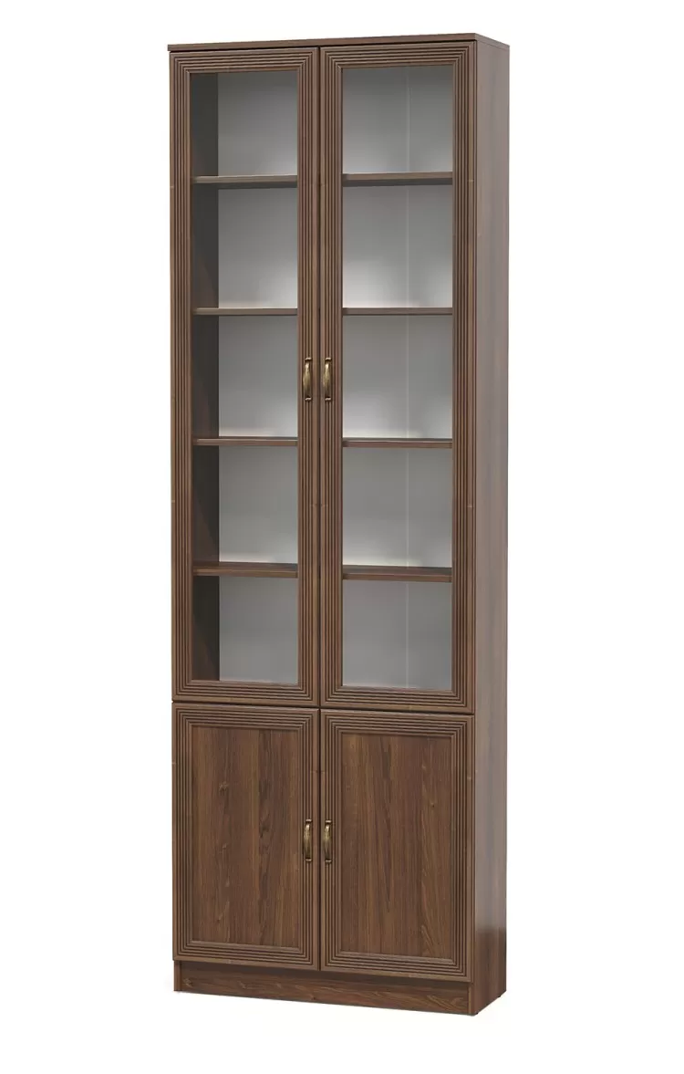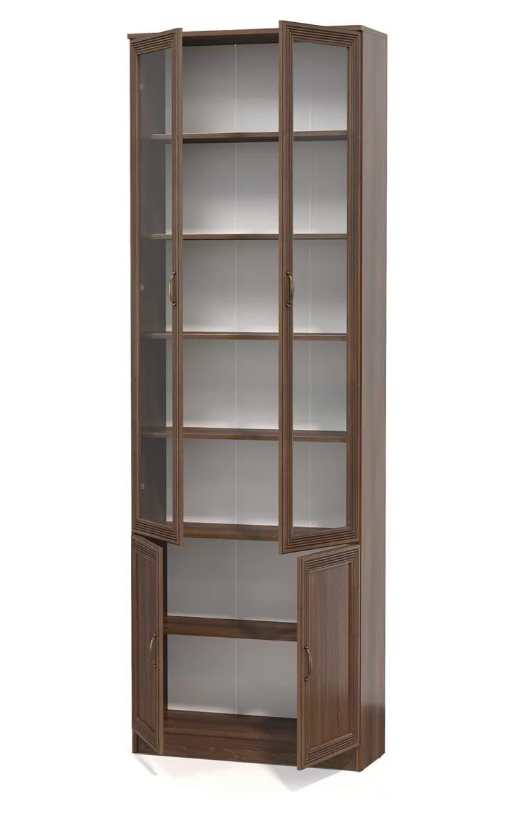 Шкаф имеет две дверки со вставками из стекла, две глухие дверки.