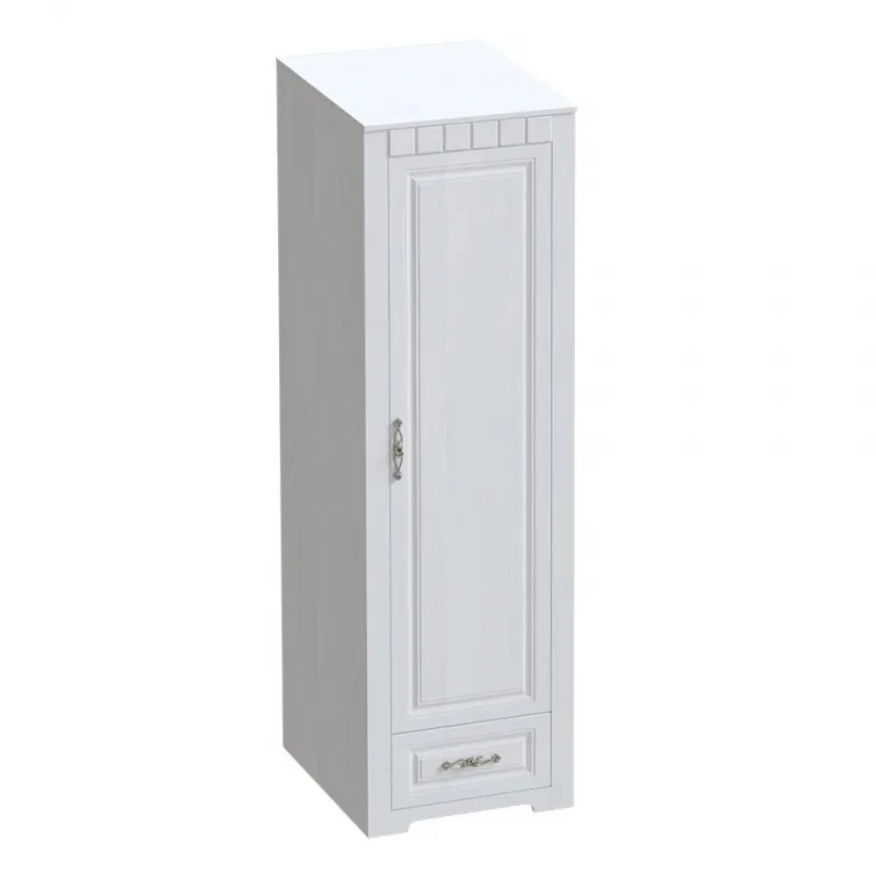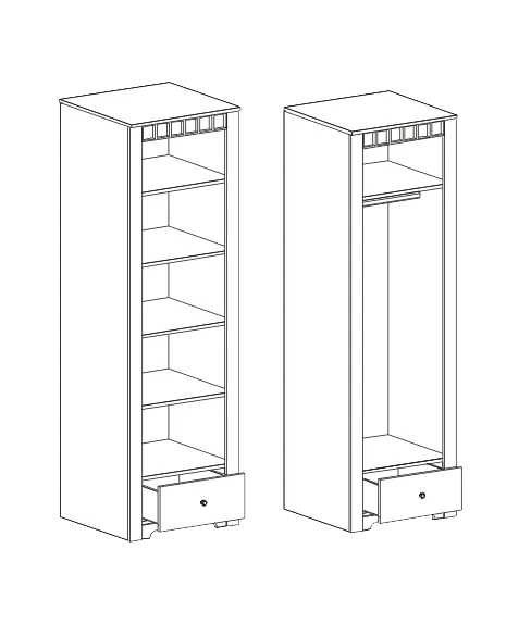 В шкафу расположены распашная дверь и ящик на шариковых направляющих глубиной 500 мм. Дверь монтируется как на левую, так и на правую сторону изделия. За распашной дверью Вы можете расположить либо четыре съемные полки, либо полку и стальную штангу по своему желанию.