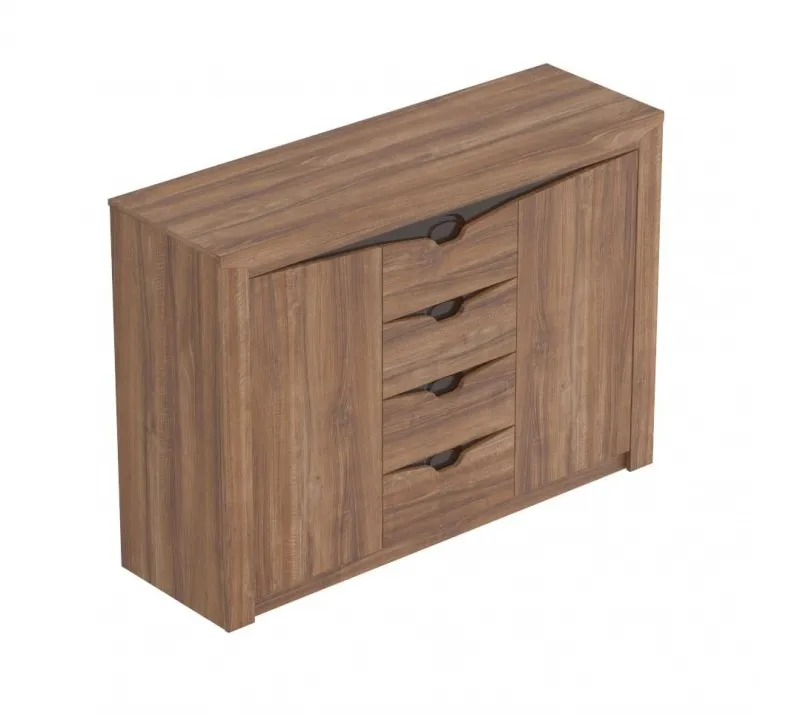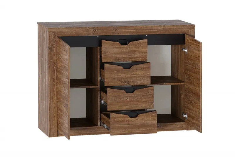 Тумба "Соренто" имеет четыре выдвижных ящика, а также два вместительных отделения по бокам с полками и распашными дверями. На фасаде имеются декоративные вырезы, выполняющие функцию ручек.