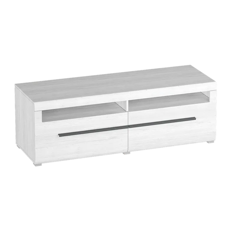 Корпус тумбы изготовлен из ЛДСП, фасады с закругленными линиями - из МДФ. Стиль изделия подчеркивают черные металлические ручки. Тумба имеет открытое отделение для хранения и два объемных выдвижных ящика на шариковых направляющих.
