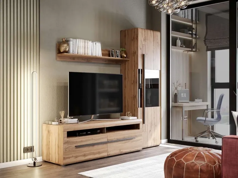 Тумба под ТВ "Ницца" выполнена в популярных цветах Дуб Вотан и Дуб Винтерберг. Природные оттенки с рустикальной древесной текстурой принесут вашему интерьеру уютное тепло и комфорт.