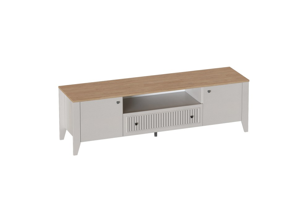 Широкая тумба оснащена двумя дверками и ящиком с шариковыми направляющими полного выдвижения.