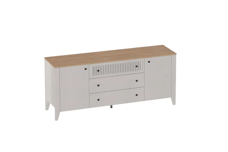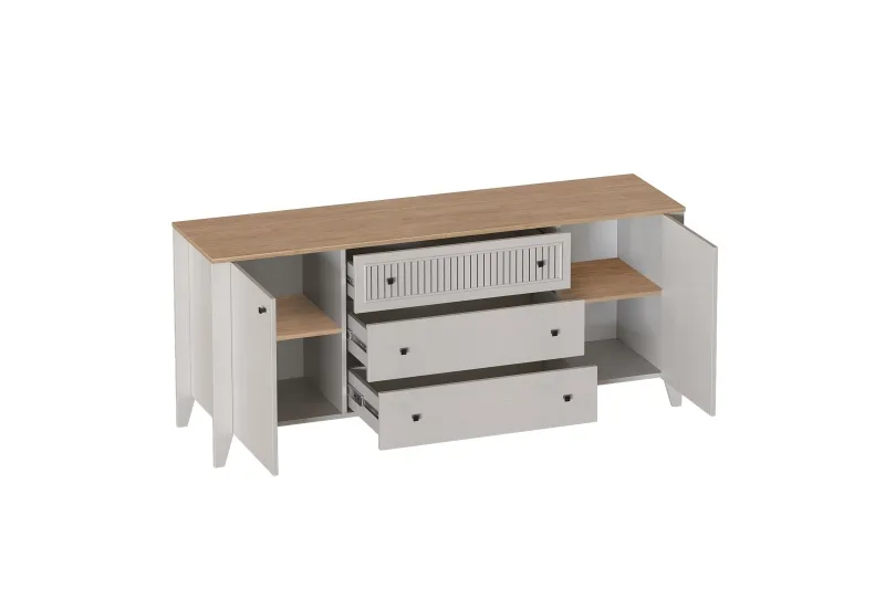 Тумба ТВ "Валенсия" выполнена в комбинации Дуб натуральный светлый / Персидский жемчуг и оснащена 3 ящиками на шариковых направляющих (без амортизаторов). Она выполнен из безопасных, качественных материалов, что гарантирует долговечность и сохранение первоначального вида на протяжении долгого времени.
