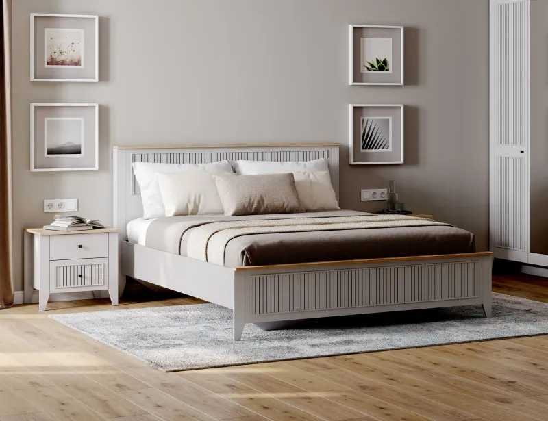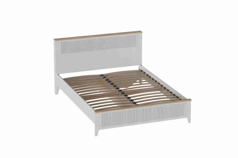Кровать Валенсия выполнена из ЛДСП в комбинации Дуб натуральный светлый / Персидский жемчуг. УФ-фотопечать полосок на изголовье и изножье в обрамлении пластиковых молдингов придает изделию оригинальный стиль современной классики. Кроватное основание с деревянными ламелями встроено в конструкцию кровати. Высота опор 104 мм. На опорах размещены войлочные подпятники